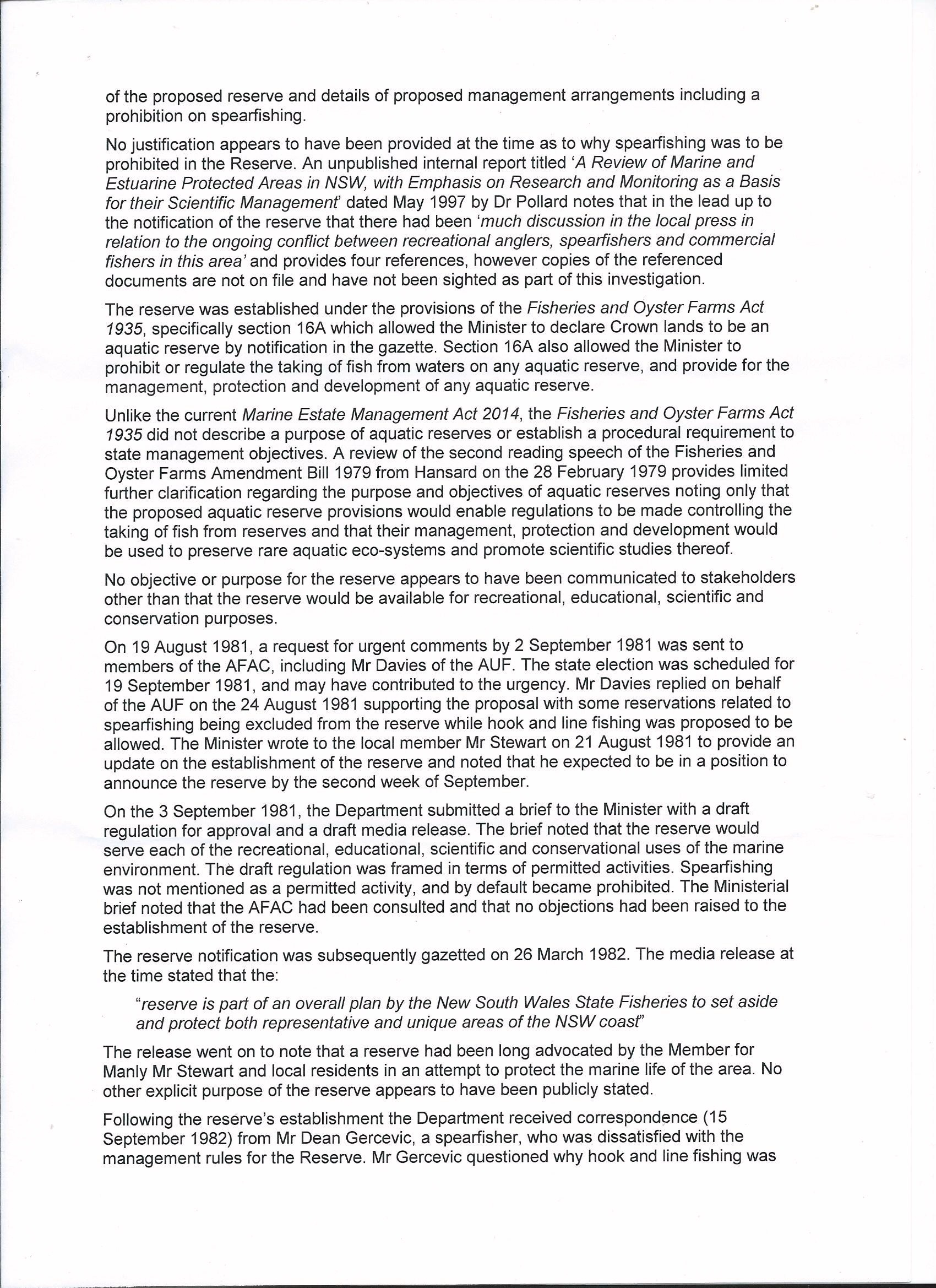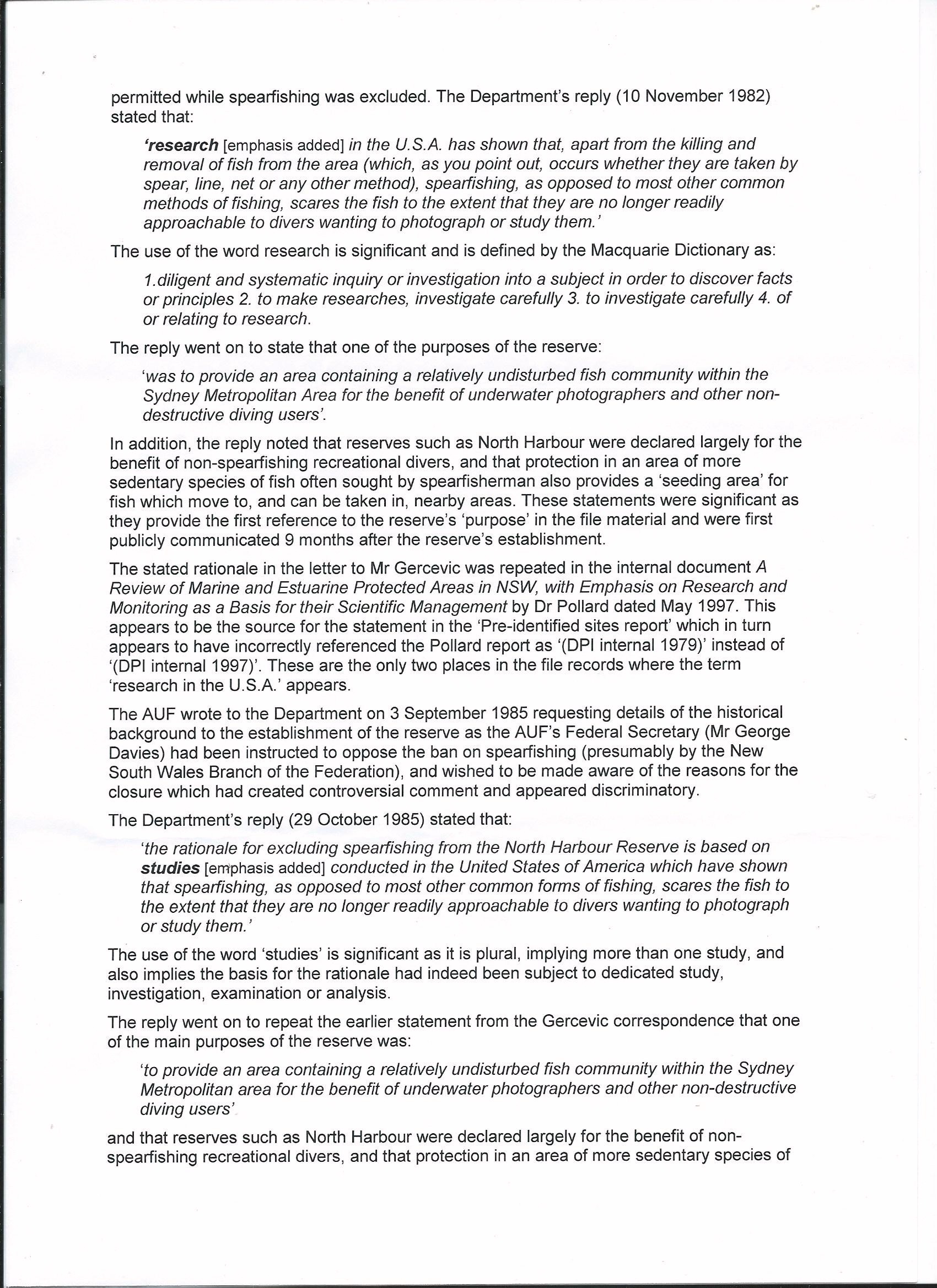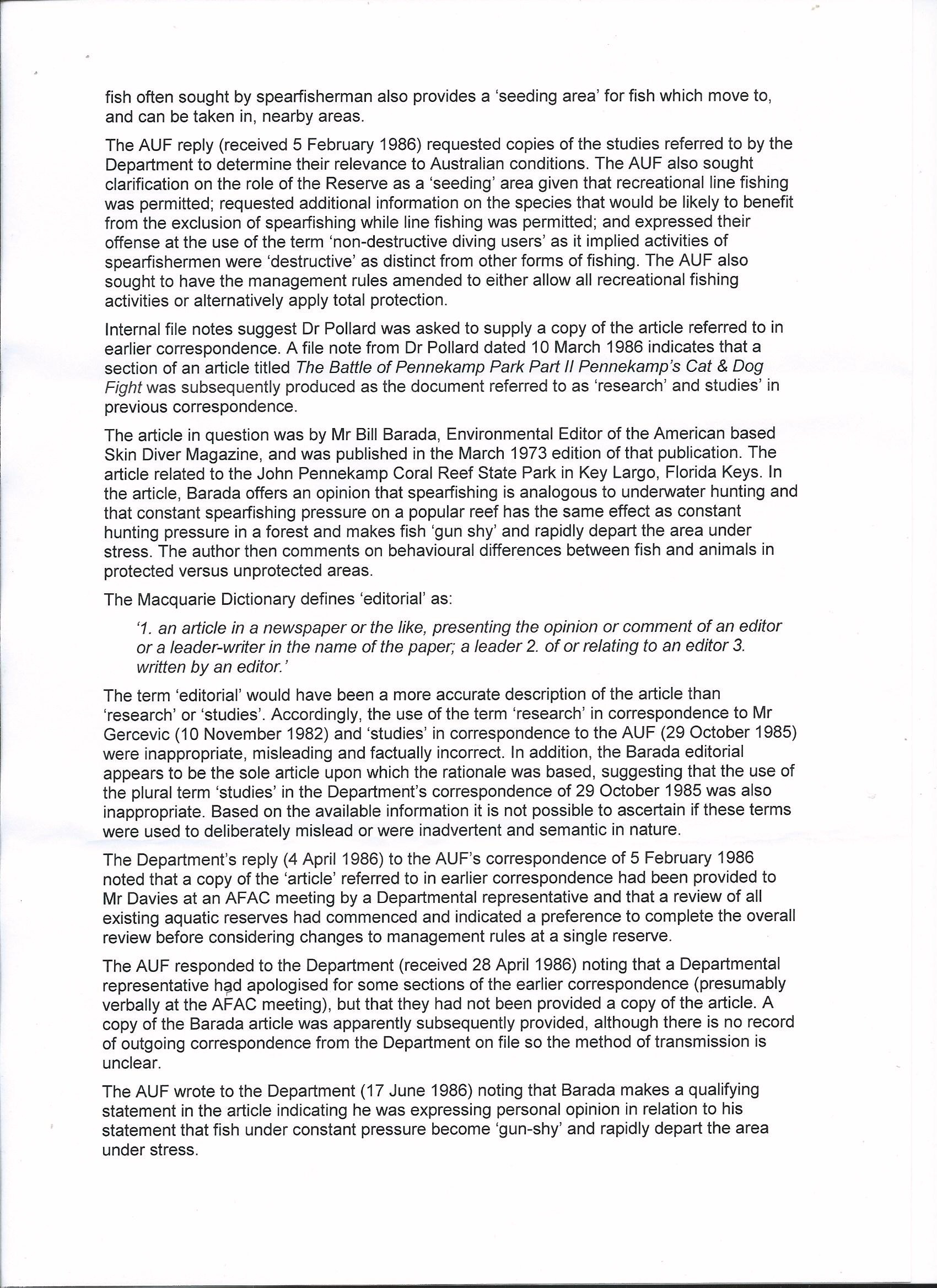 Previously the reasoning for excluding spearfishing from the North Harbour Aquatic reserve whilst continuing to allow other forms of recreational fishing was only made in correspondence to the USFA. To now see this claim, which was utterly false, appearing in print necessitates the strongest possible response.